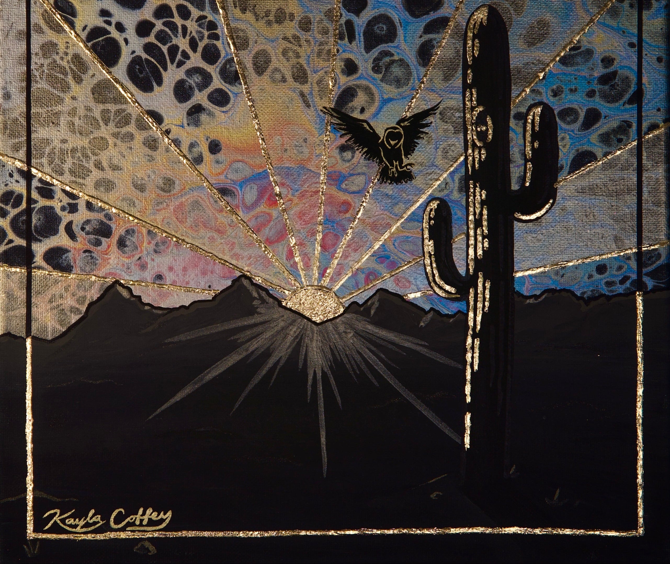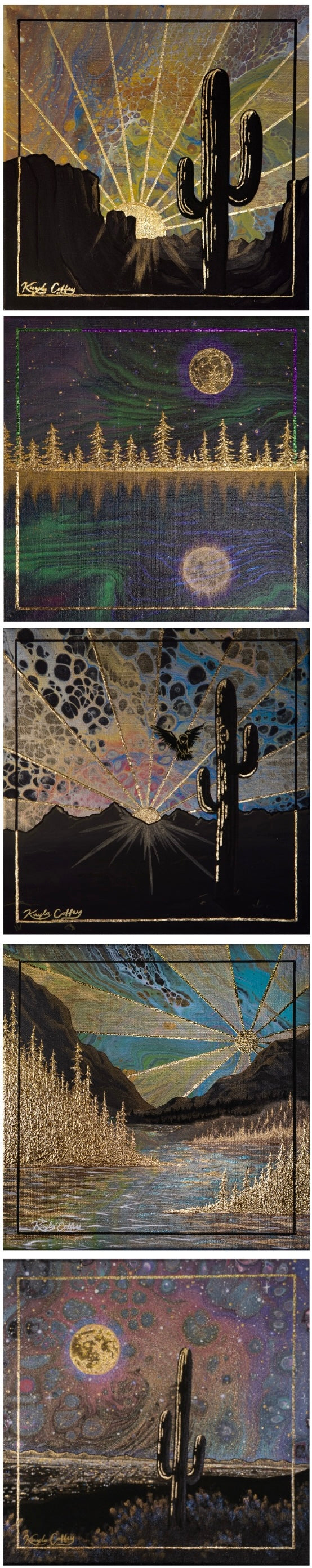 Now, I’m resurrecting old acrylic pours and turning them into skies, layering them with silhouette landscapes, gold-lit sunsets, and ethereal night scenes. Each piece carries the glow of a second chance, reflecting the healing, gratitude, and magic that come with starting over.