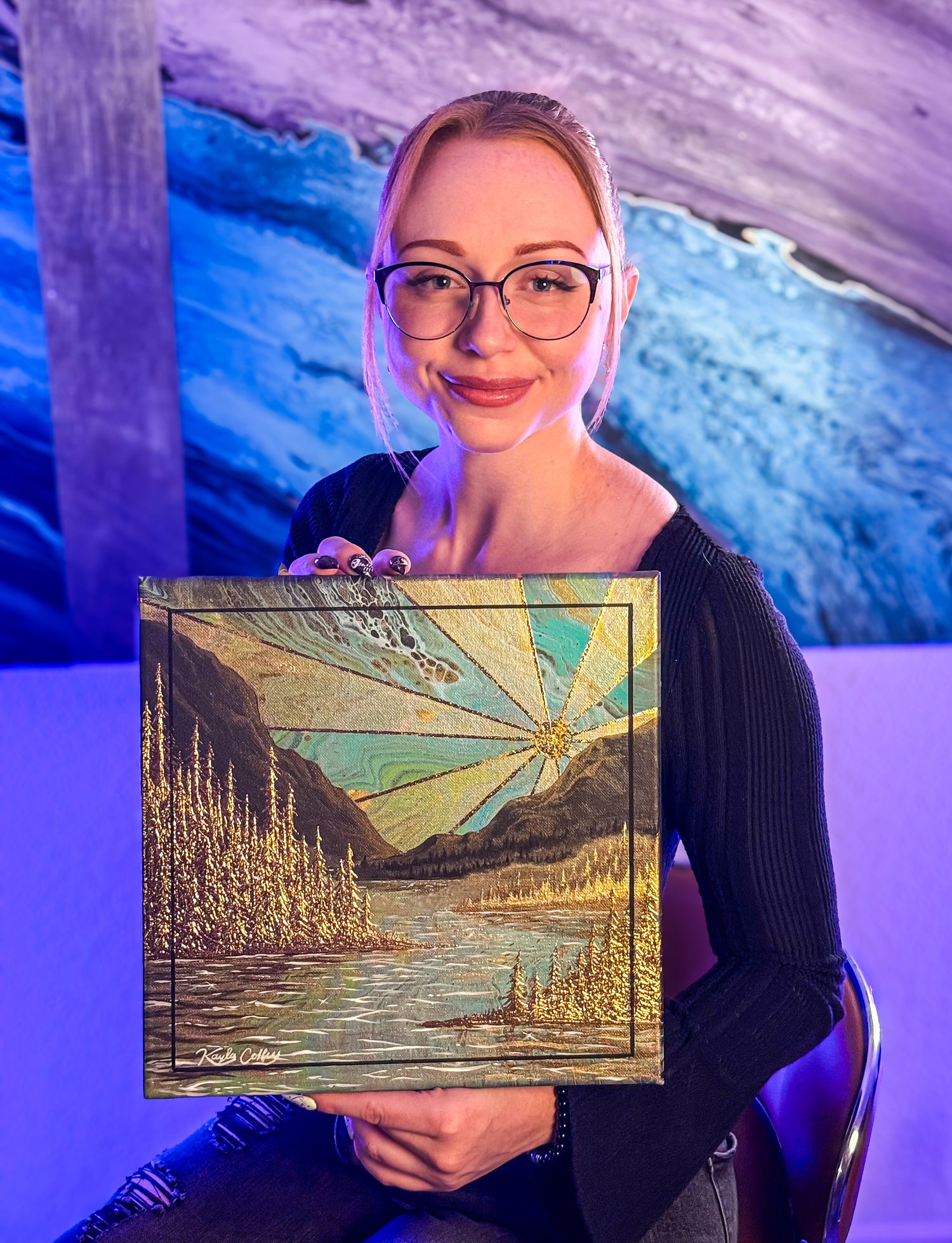 Now, I’m resurrecting old acrylic pours and turning them into skies, layering them with silhouette landscapes, gold-lit sunsets, and ethereal night scenes. Each piece carries the glow of a second chance, reflecting the healing, gratitude, and magic that come with starting over.