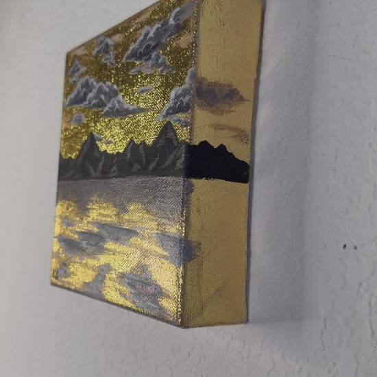 A luminous study in reflection and light, Gilded Realm distills the quiet majesty of mountain and sky into pure alchemy. Across a horizon of molten gold, indigo peaks rise against drifting clouds, their silhouettes mirrored in waters that shimmer with subtle iridescence.