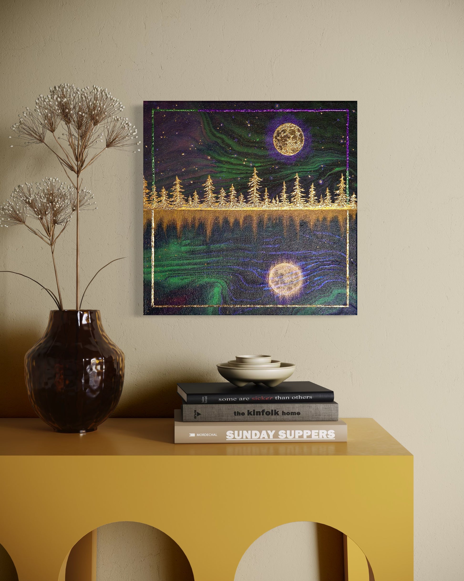 A gilded tree line stretches across the horizon, shimmering with new texture, each branch a thread between worlds. Above, a radiant full moon crowns the night sky, glowing against aurora-green waves and flecks of violet starlight. Below, its twin reflects in dark waters, a quiet echo rippling in golden haze. Between them, the trees become a threshold, equal parts earthly and divine, matter and spirit, seen and unseen.