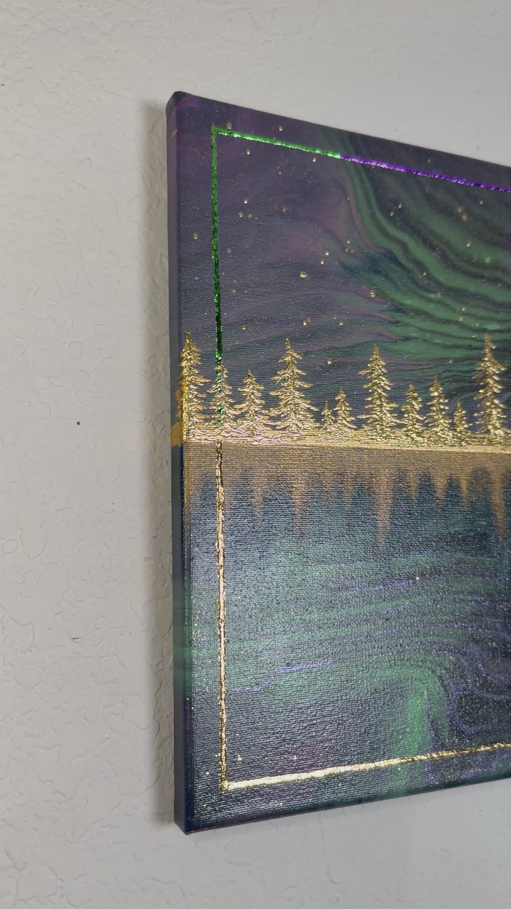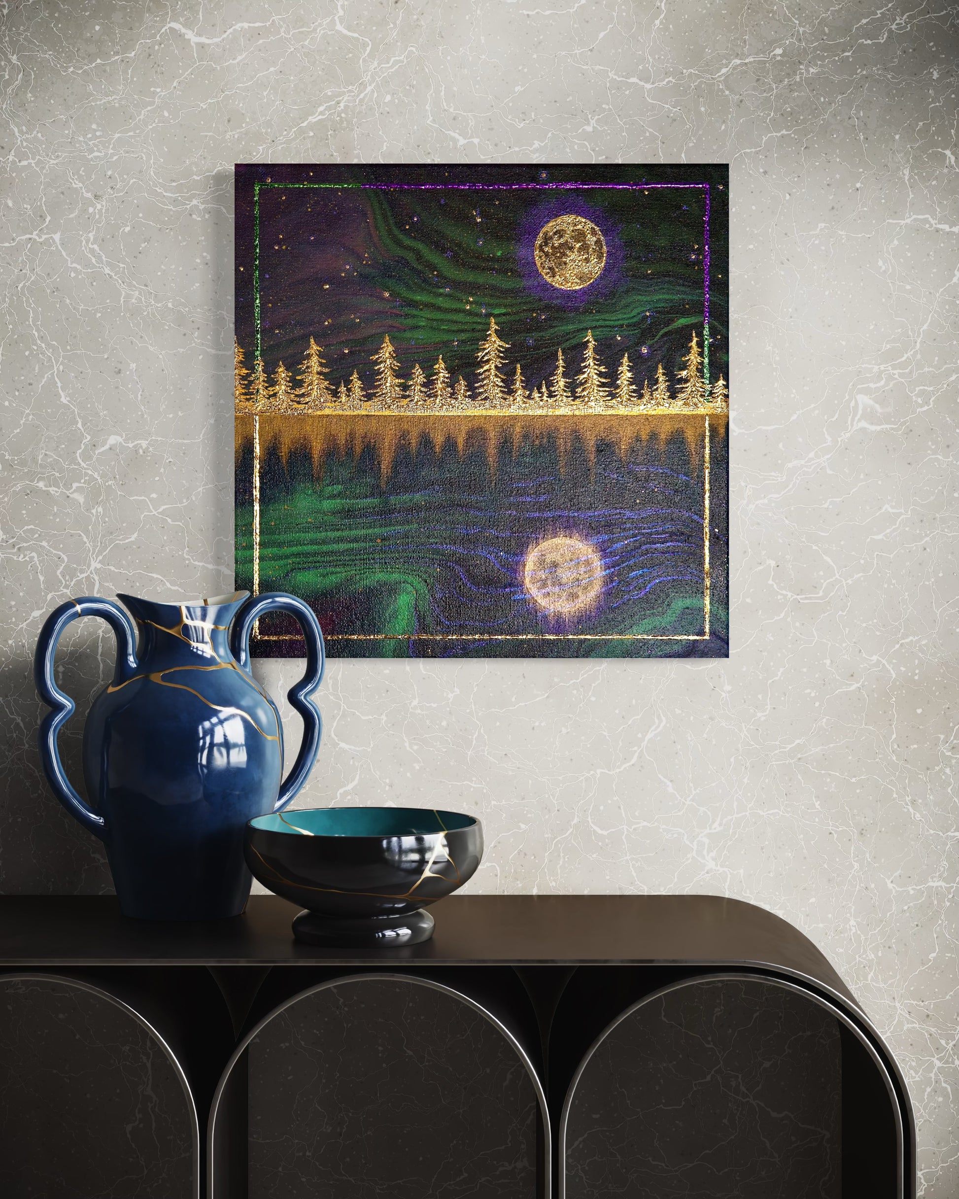 “Celestial Aurora” is my meditation on reflection. Not just the mirror on the water, but the way inner and outer worlds answer one another. The more light I allowed myself to claim inside, the more it shimmered back at me in the studio. This piece taught me that balance doesn’t mean silence; it means dialogue — heaven whispering to earth, and earth listening, trusting and responding in kind.