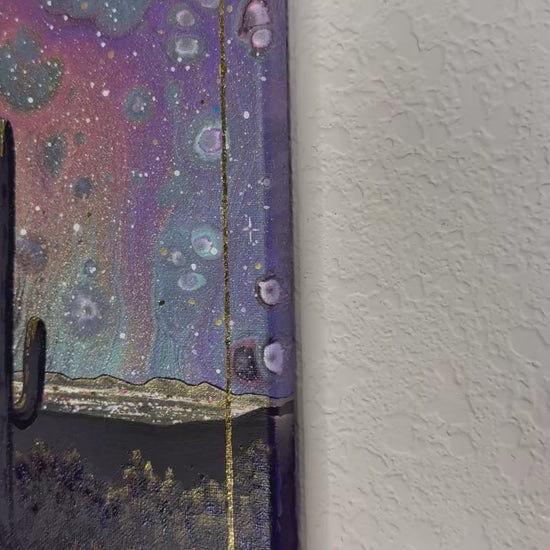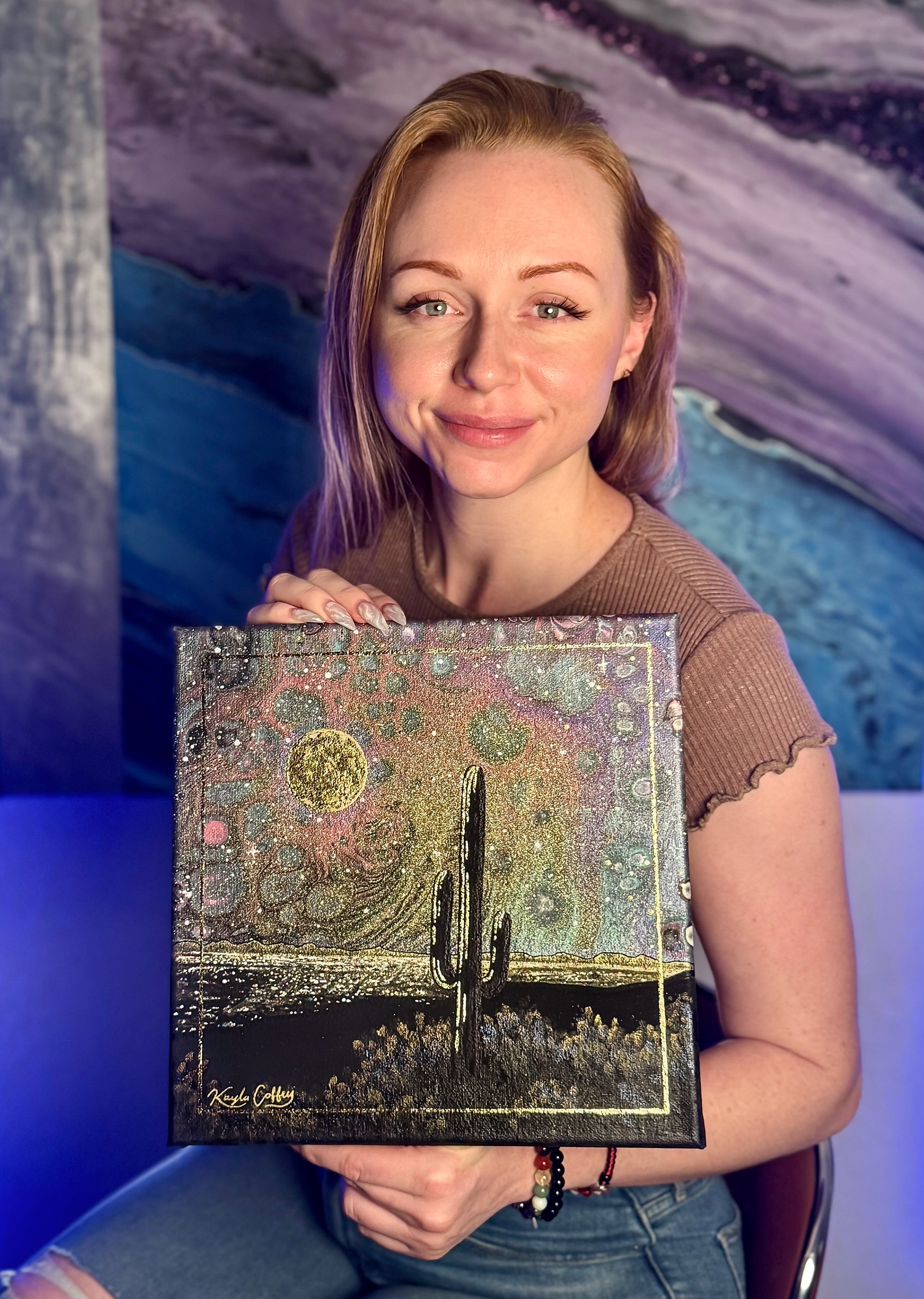 From the outlook on Mt. Lemmon, Tucson sprawls below like a galaxy scattered across the desert floor, each glimmer a heartbeat of the city I call home. A lone saguaro anchors the scene, its silhouette tall against a sky alive with marbled violets, blues, and rose-gold. Overhead, a gilded moon glows, watching as earth and sky mirror one another in luminous rhythm. It is the desert, yes, but it is also infinite, cosmic, eternal.