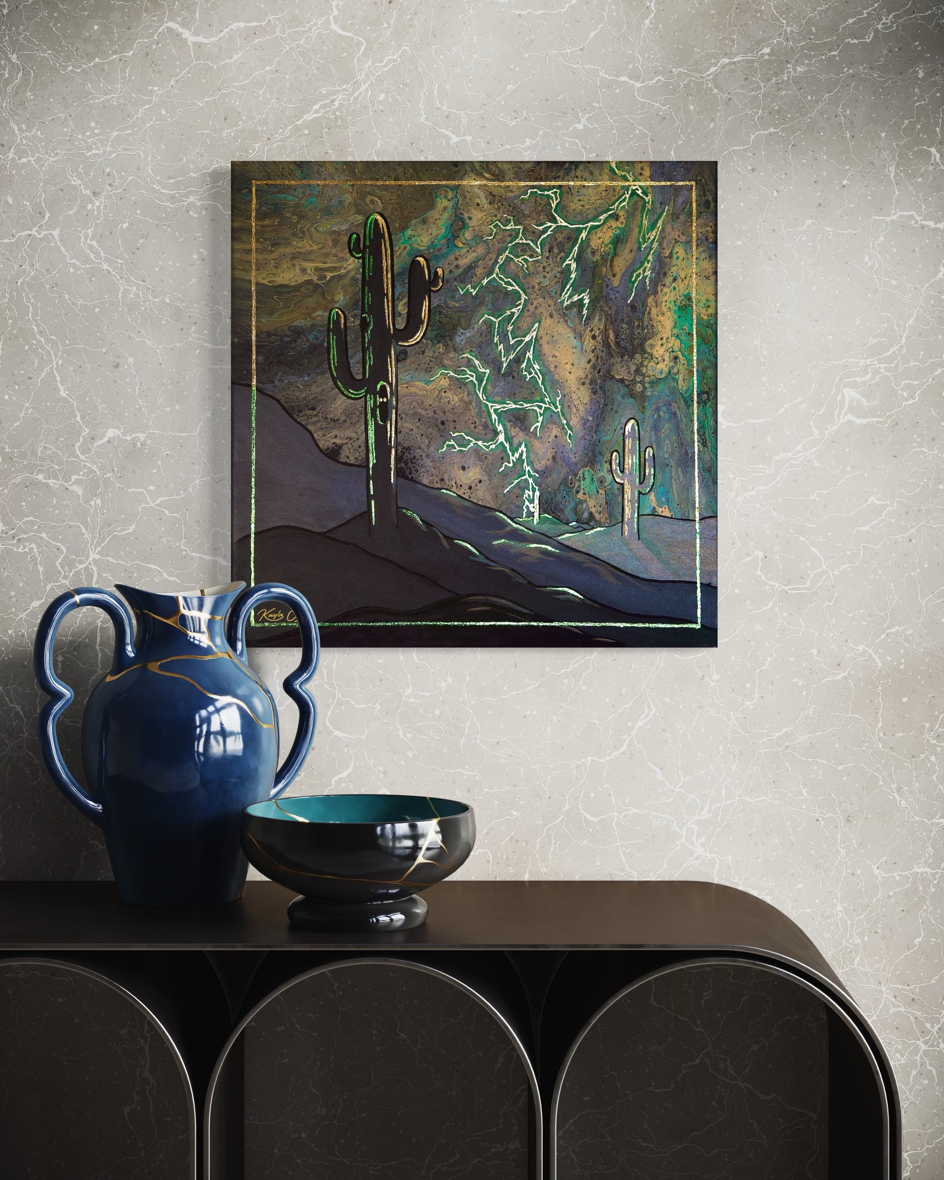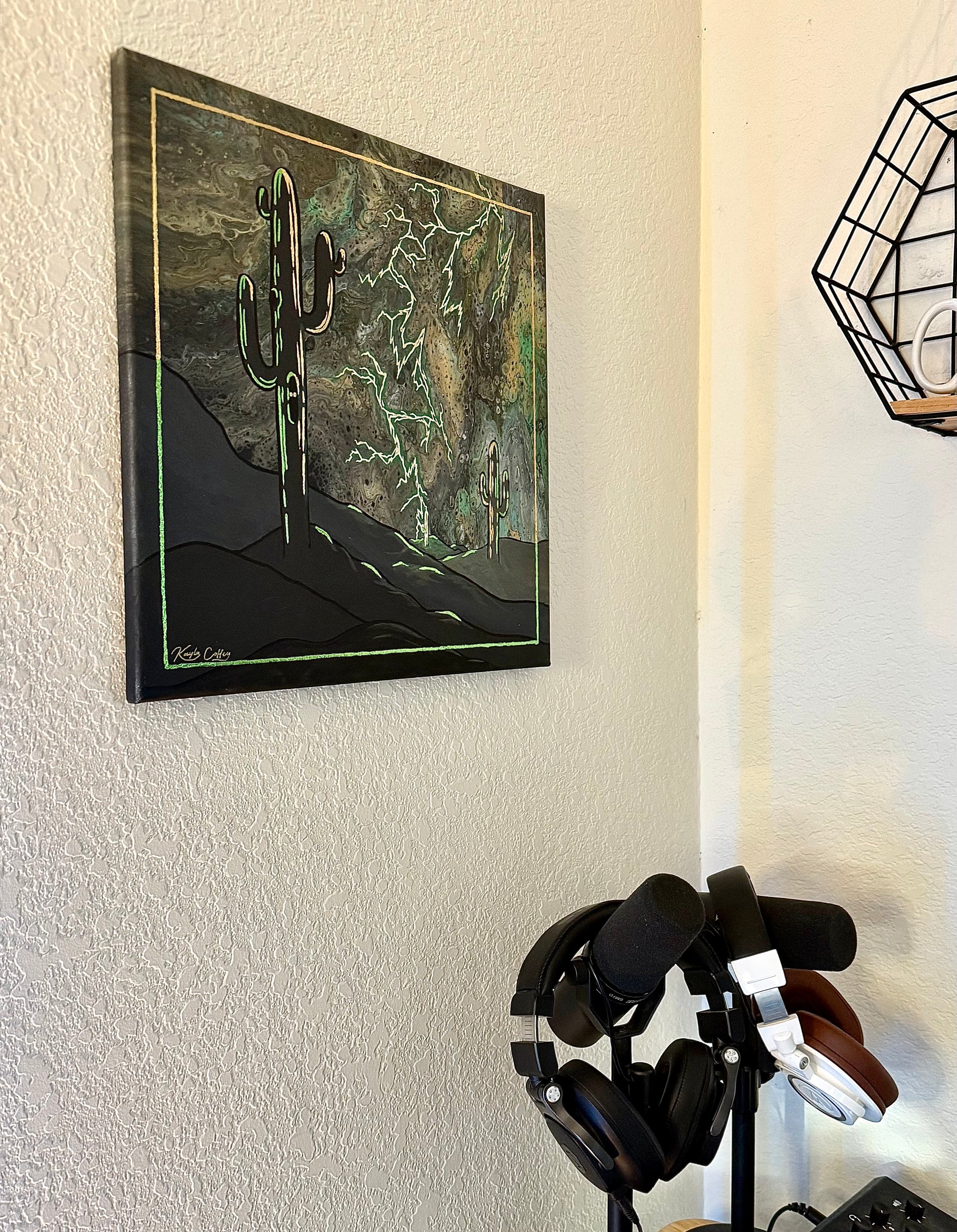 Against storm-marbled skies, jagged bolts of green-lit electricity split the night. One saguaro is struck, seared by the charge. Another glows in blinding radiance, bathed but spared. A third stands far in the distance, quiet but trembling, holding the fear of what might come next. The desert here is not still, it’s alive, volatile, and balanced in its chaos.