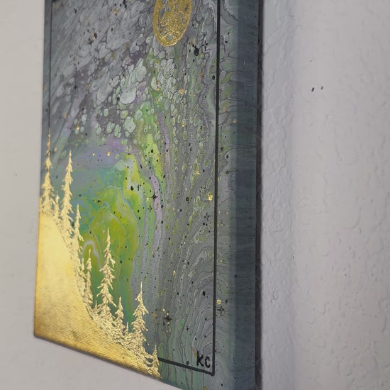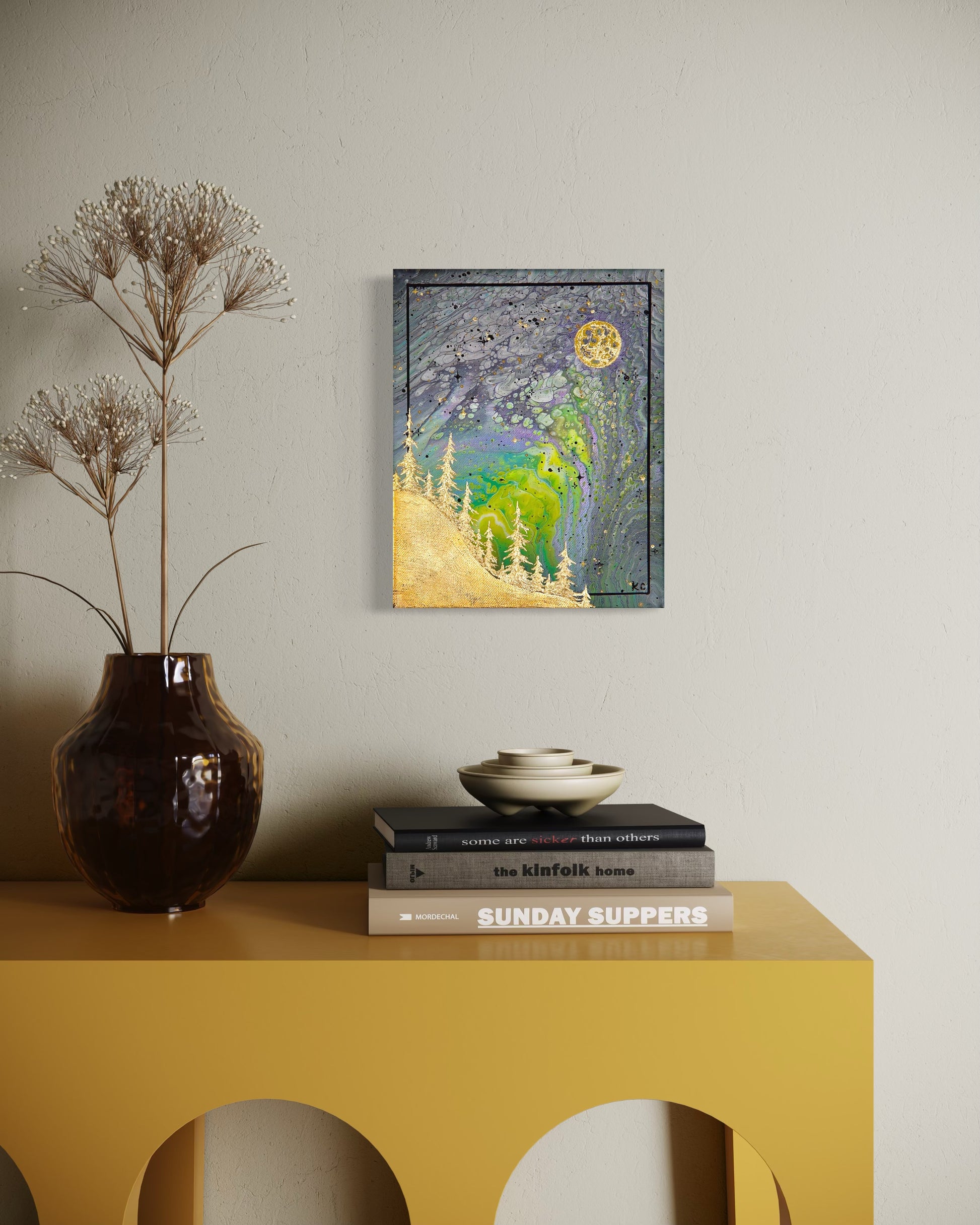 Phantom Pines rises as a spectral forest, textured gold trees cresting a hillside beneath an inverted sky of shifting greens and violets. Above, a gilded moon glows against marbled darkness, its light revealing what once was hidden. With new trees and ancient skies this piece is rooted in presence yet haunted by absence. It carries the feeling of return: one of the first visions to emerge after Desert Ascension, a reminder that even after silence, whole landscapes can be called back to life.